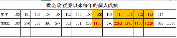 歐金政100年起至114年的年度業績一覽表11379萬元